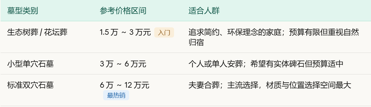 以下价格为参考区间,实际以园方现行报价为准,不同地段、朝向、材质会影响最终价格。